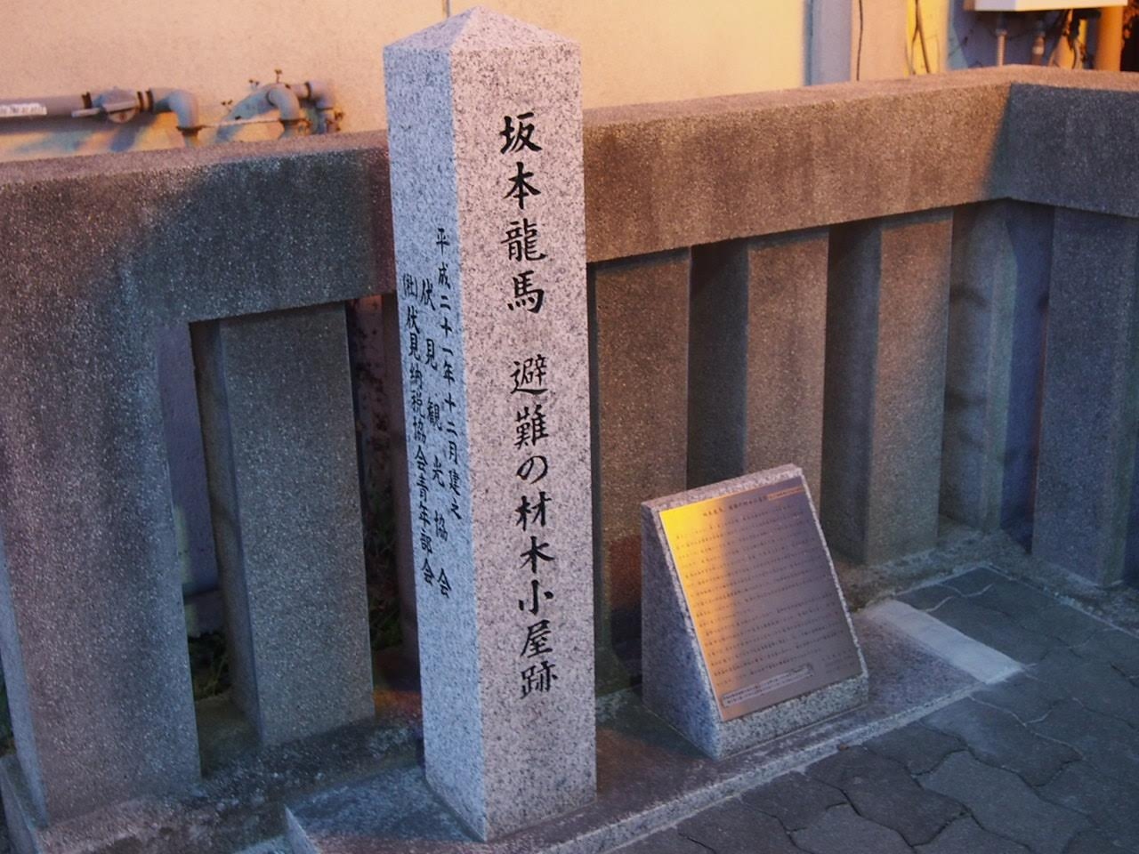 寺田屋に居たところを伏見奉行所に急襲され材木小屋に隠れたとされていますがその小屋跡として碑が建てられています。