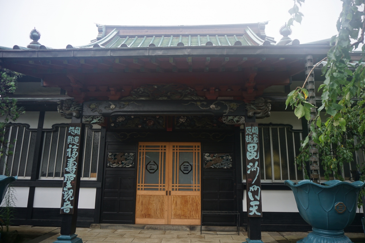 本堂のデザインも薄緑の文字は屋根の色調に合わせたもの。それらしい気の配りようも感じます。