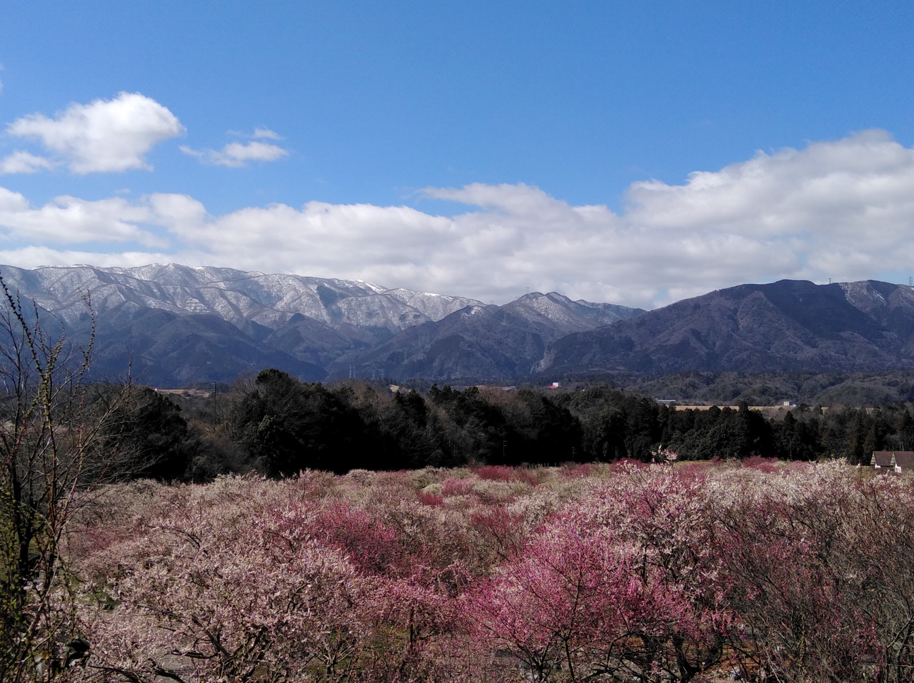 白、紅、ピンクと青空に映える美しさ。全体的に写真で見るより白やピンクの薄い色合いが多い印象でした。梅林公園内を花を見ながら一周してから展望台に行くと上からの眺めは一層素晴らしく感動です。鈴鹿山脈の雪景色を背景に梅の花のジュータンの様な光景に心奪われました。快晴でしたが、風が強く冷たく防寒対策して出掛けて正解でした。