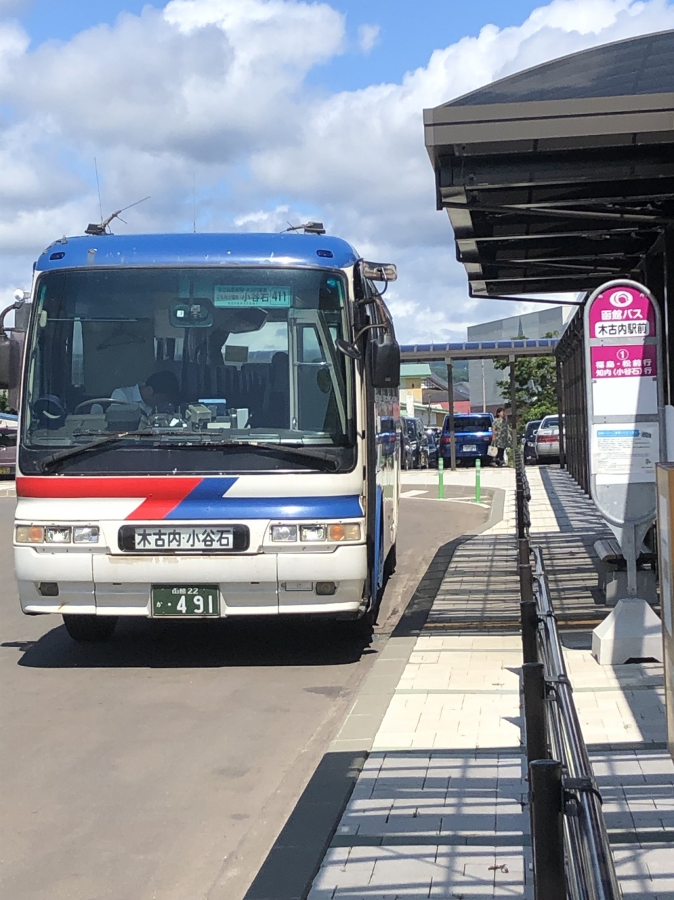 道の駅 木古内から乗車しました。道の駅では、それぞれの乗り場から出るバスが沿線の観光施設に行くときの所要時間や運賃、最寄りのバス停を表示していて、この会社はとても親切な対応をしているなと感動しました。