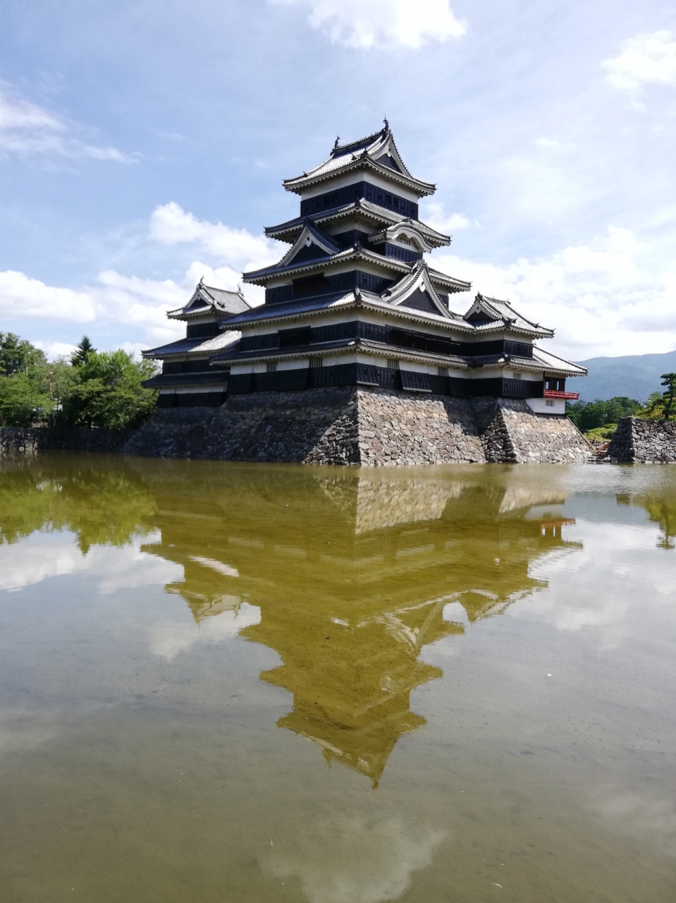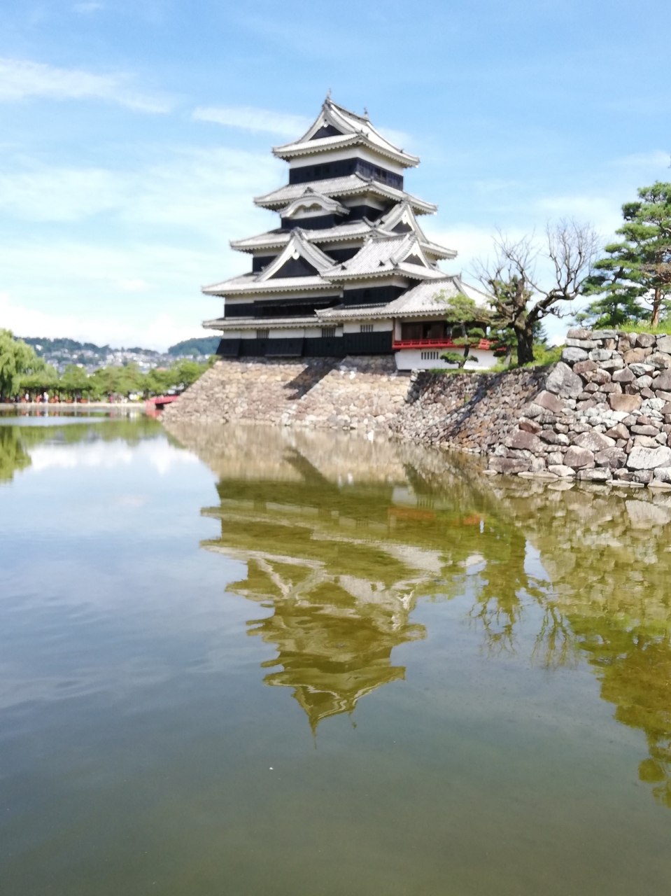 日本有数の現存天守 そして国宝として有名な松本城は さすがこのお盆の時期は大盛況で、 ひとひとひとだらけである。 天守閣入場は なんと2時間待ちである。こんな炎天下の中で2時間なんて待ってられないのでここはパスします。 青い空と 堀に映り混む逆さの城は絶景であった。 無料のボランティアの方の説明を聞き 有意義な時間を過ごさせてもらいました。ありがとうございました。