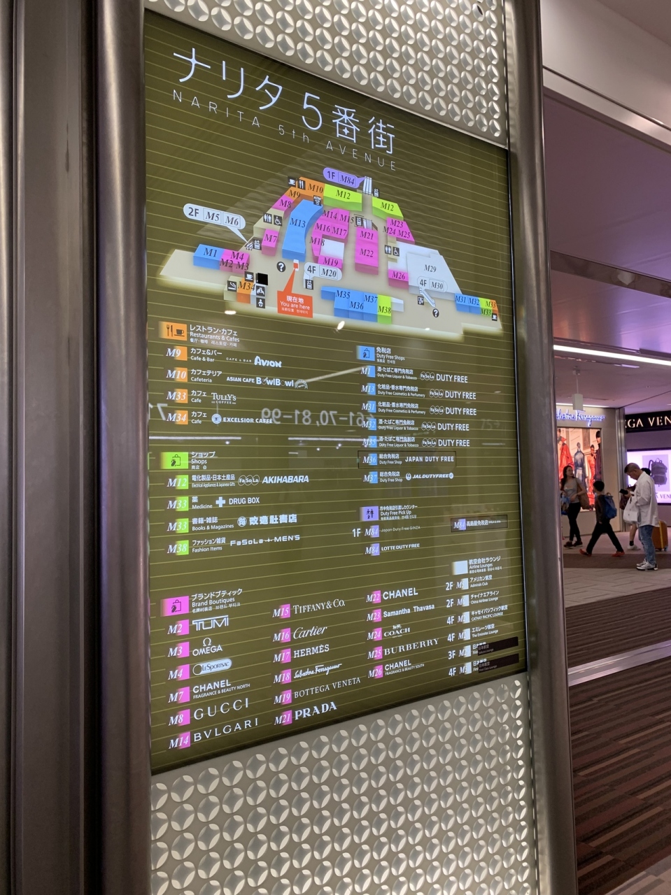 成田空港第一ターミナル内にある免税店通りです。手荷物検査や出国手続きを終えたあとのエリアにありました。いろいろとお店がありますが、散らばっているため、飛行機の時間に間に合う余裕をみて回ることをお勧めします。