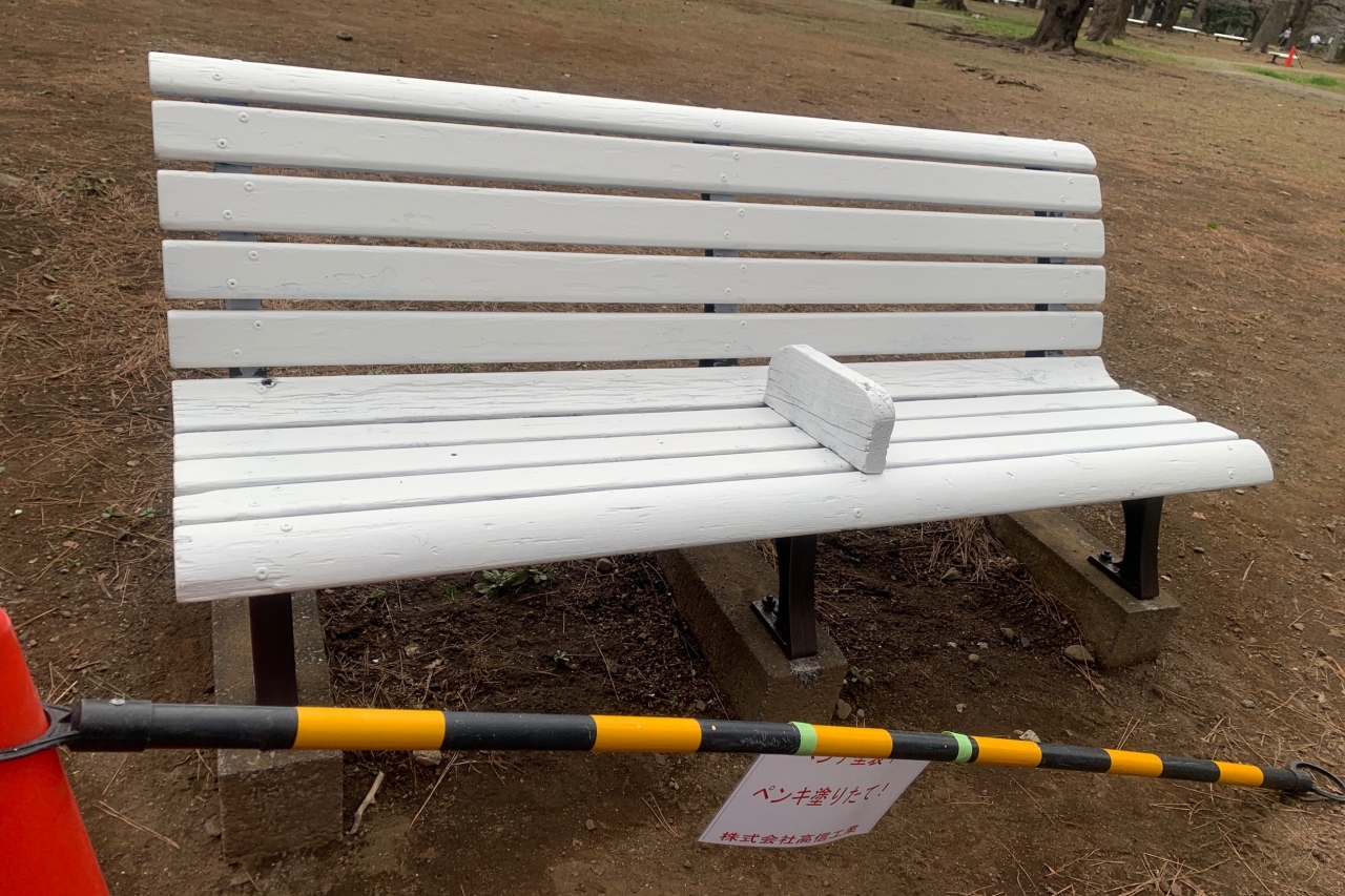 花見に向けてか?年度末の予算消化かわかりませんが、ベンチのペンキ塗り直し作業が行われていました。