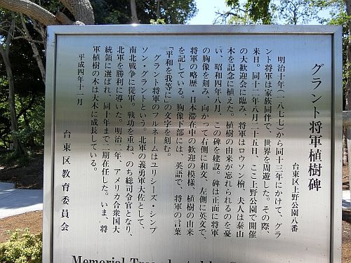 大統領退任後の1879年に世界一周旅行の途上、来日した際に上野公園に夫妻で植樹したことを記念し、1929年に石碑が建てられました。春先まで石碑の周りで工事が行われていたため、しばらくの間仮囲いの中にありましたが、訪問時は再び姿を現していました。上野動物園の表門の近くにありますが、立ち寄る人も少なくひっそりとたたずんでいます。