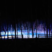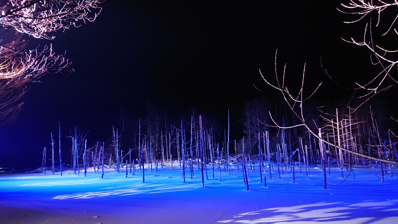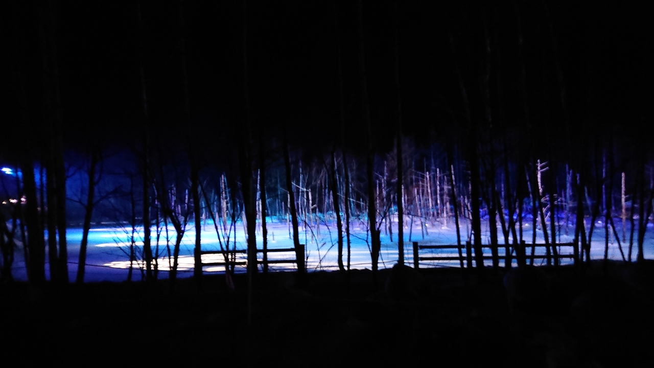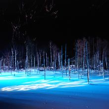 駐車場から坂があって青い池の見えるところにいくと青くなくて雪が表面に積もっているのか白い池があり、ライトで雪原を照らしていました。ライトアップの灯りは7分周期と聞いていますが音楽なども無いので静かです。比較的寒くない日に行きましたが寒い日だと寒さを避けるところが無いので凍えると思います。