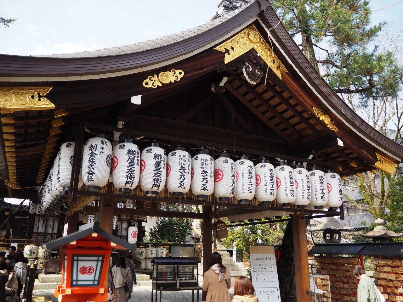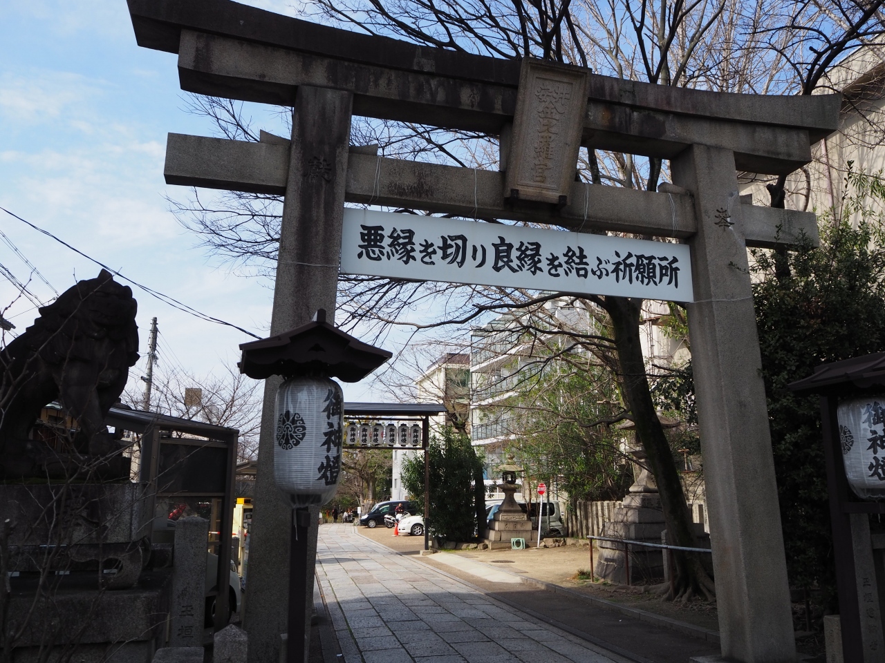 祇園の歌舞練場の少し南にあります。崇徳天皇や大物主神などをお祀りする神社です。たくさんの形代が貼られた「縁切り縁結びの碑」が有名です。多くの参拝者が拝殿でお祈りした後、この碑の中央にある50センチほどの穴をくぐっています。最初は悪縁を切り、戻りは良縁を結ぶということです。そのあと形代を碑に貼ります。いつもかなり多くの方が並んでいます。