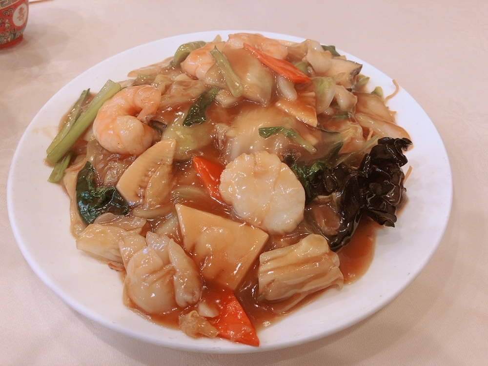 餡がしっかりかた焼きそばに馴染むまでまずは少しずつ海鮮具材を楽しむのが良い。