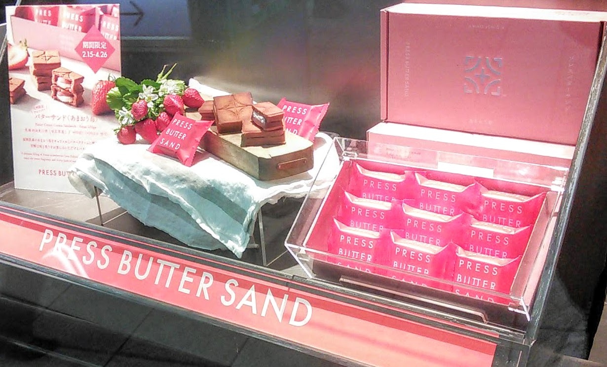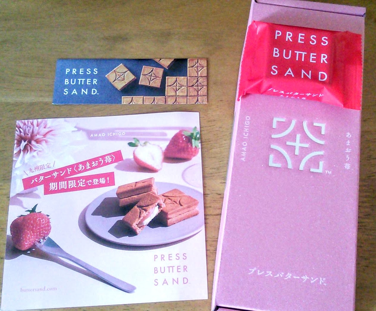 北海道きのとや系列のバターサンド専門店です。4月26日までの期間限定で、これまで博多に行かなければ入手できなかった「あまおう苺のバターサンド」が販売中だったので、5個入り(1242円)を購入してみました。クッキー生地もほのかにピンク色で、中にピンク色の苺バターキャラメル少々と、苺ジャム入りバタークリームが入っています。いちご風味のさくさくクッキーサンドでした。