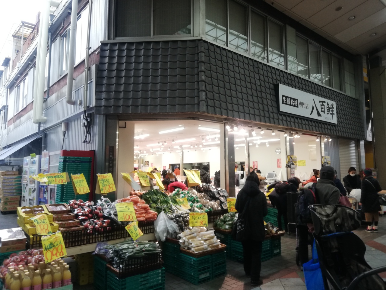 九条駅前の商店街。屋根があるので、雨の日もお天気を気にせずに利用できるのがいいですね!100円からアウトレットの洋服がある「Colors」、安くて人気で激混みの生鮮スーパー「八百鮮」、昔ながらの純喫茶、マクドナルド、携帯ショップなどがありました。ちなみに、駅の反対側にも「キララ九条」という商店街がありました。