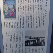 両国駅に近い総武線鉄橋の近くから両国橋のたもと辺りまで、隅田川の東岸壁の護岸のために打たれた杭が百本杭跡です。明治時代以降それらの杭は新たな護岸工事によって抜かれて行き電材はその姿はありません。説明板は2か所にありますが、杭の姿はまったくなく、案内板を読むだけです。
