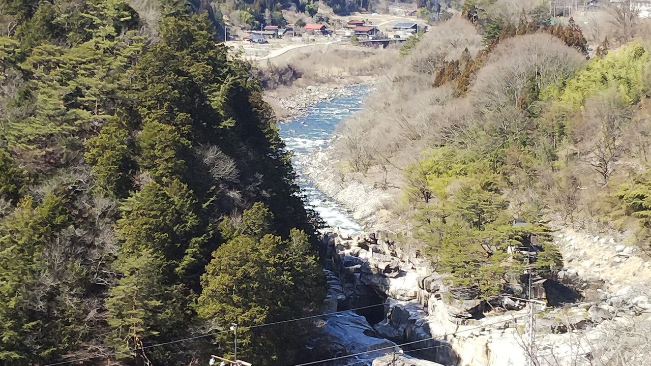 お茶と赤カブの酢漬けが出て美味しかったです。お蕎麦を待ってる間に眼下に見える寝覚の床を写真取りました。木曽川と寝覚の床が神秘的です。