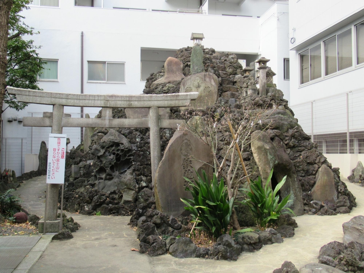 関東大震災で被害をうけ、昭和10年 (1935) より復興、整備され、社殿の右手奥に、富士山の溶岩で築いて富士塚があり、そこを富士信仰の場としていた。