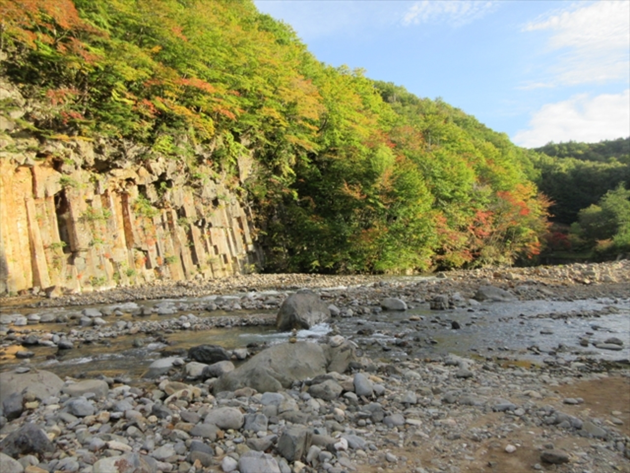 松川温泉に行く途中の川沿いにできた渓谷で、秋には紅葉の名所として知られています。特に玄武岩の地肌が剥き出しになっている松川玄武岩の柱状節理の周辺は、川の青さ、岩肌の黒さが木々の紅葉とコントラストを成して、とても綺麗でした。なお、周辺は熊が出没するようで、注意を促す看板があちこちにありました。