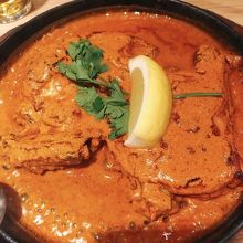 銀座店でしか食べられないタンドリーチキン(1820円)は鉄板の上に大きなチキンが2Pグツグツの状態で提供されます。チキンは簡単にナイフでほぐれるほど柔らかく、濃いオレンジ色のソースが濃厚で評判どおりの味でした。
