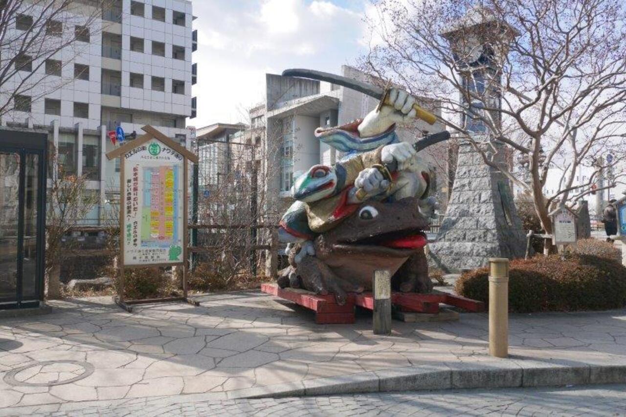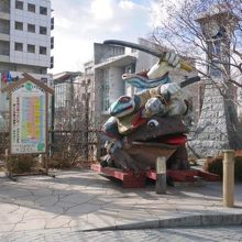 寂れた縄手通り商店街を自転車でぶらついていたら、大名通り側の突き当りにこの大きな像がありました。妖怪なんでしょうか?毒々しくてかなりのインパクトでした。昼間だったので平気でしたが夜見たらかなり怖いと思いますよ。