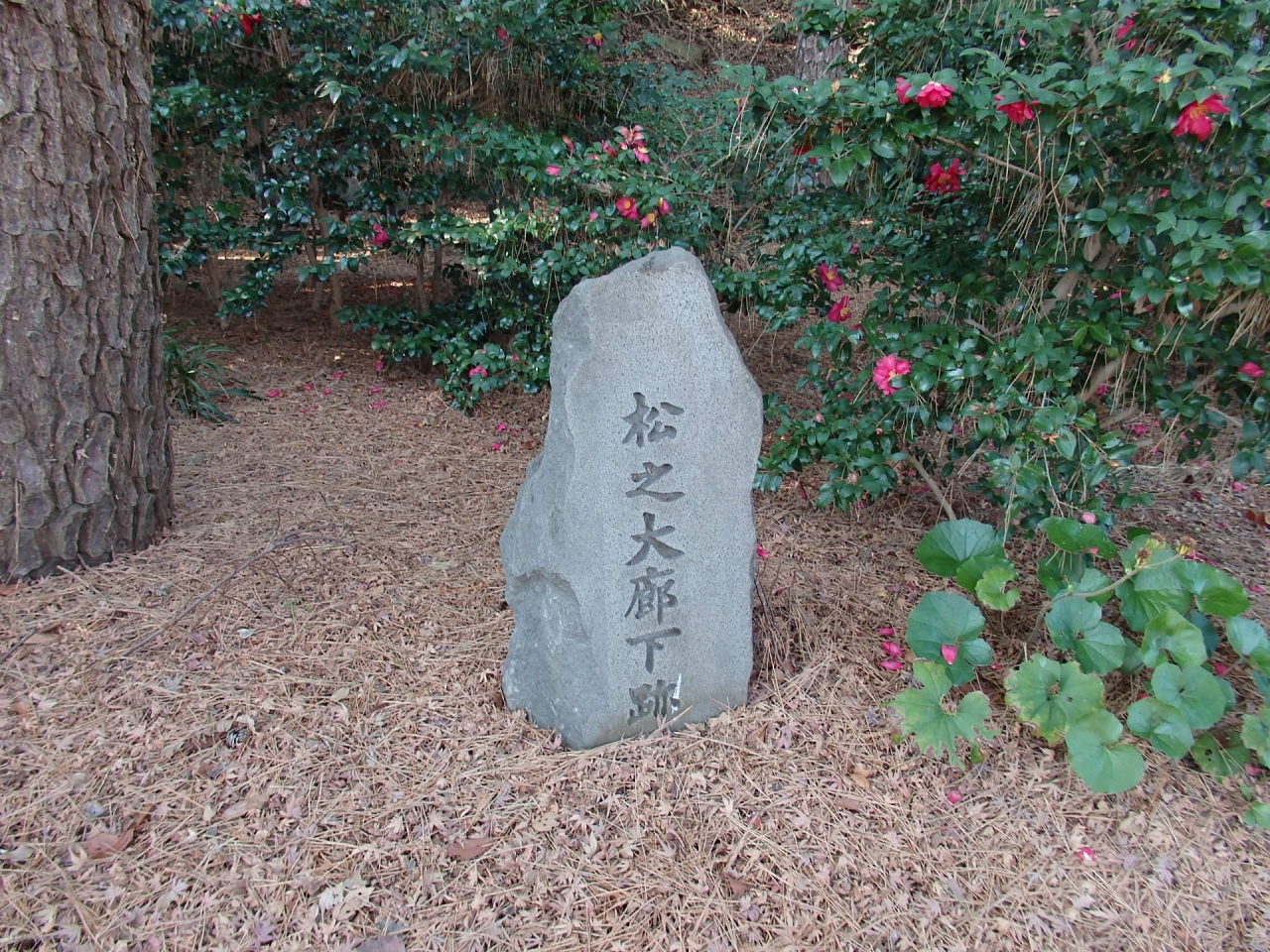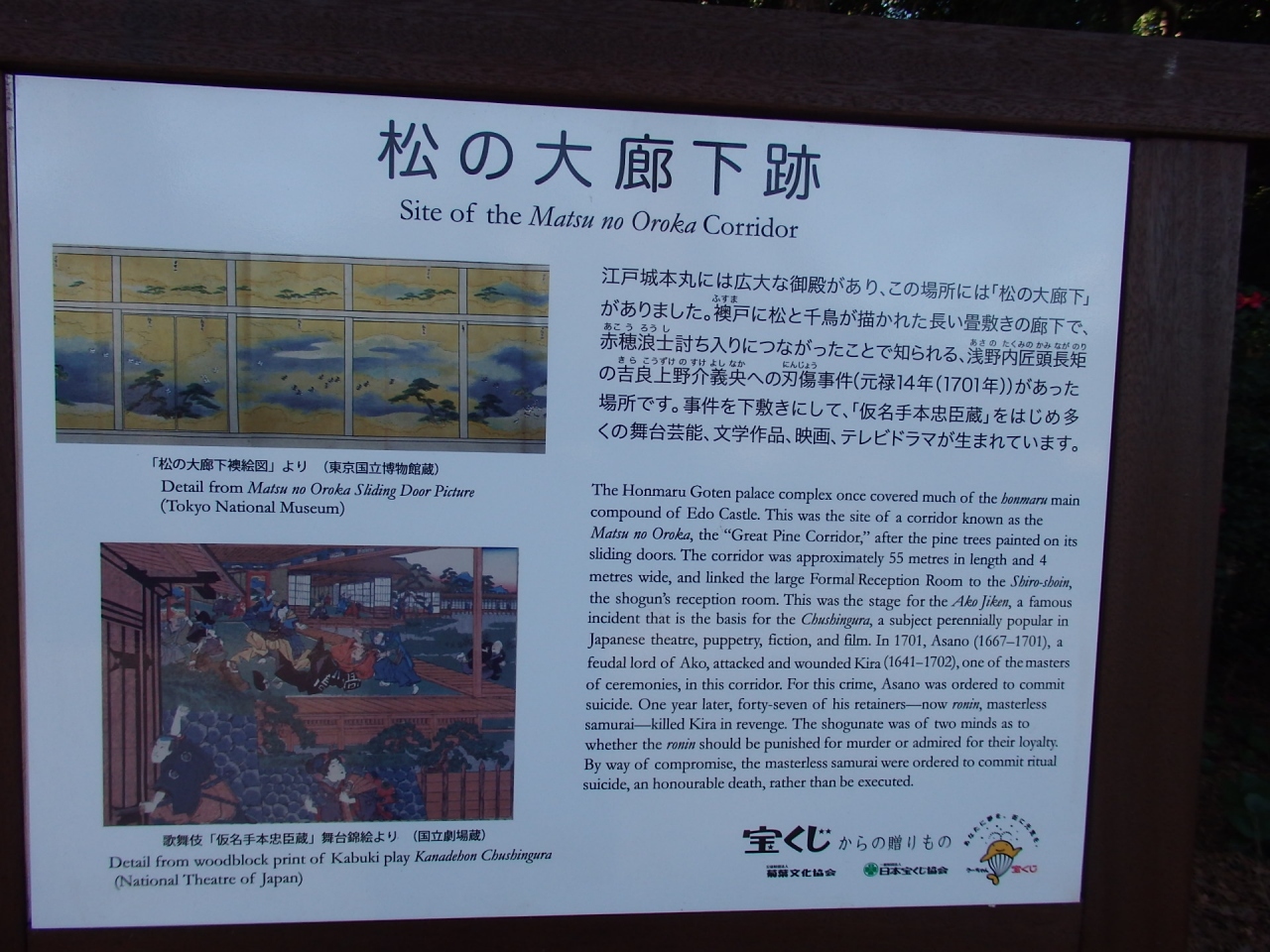 赤穂浪士討ち入りに繋がった、浅野内匠頭長矩が吉良上野介義央に切りかかった刃傷事件があった表御殿の長い廊下です。襖戸に松と千鳥が描かれていたので付いた名前です。石碑と説明版が設置されていますが、イメージが湧いてきません。やはり昔見た映画(市川右太衛門、月形龍之介)(長谷川一夫、滝沢修)(松本幸四郎、市川中車)(前者;大石内蔵助、後者;吉良上野介)のシーンを思い出してみて想像しました
