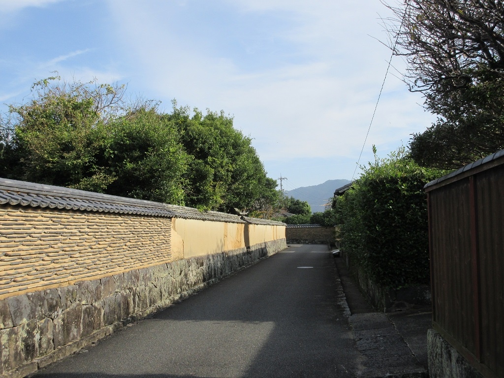 萩の城下町を散策し、堀内地区を歩いた後はその東南にある平安古地区へと歩を進めました。この平安古地区を代表する景観とされるのが、こちらの鍵曲です。高い土塀に挟まれた路地すすむと、途中で道が鍵のように曲がっていました。市街戦の際に敵の侵入スピードを遅らせる効果を期待してこのように作られたとのこと。時代劇のセットとして使えそうな景観が楽しめました。