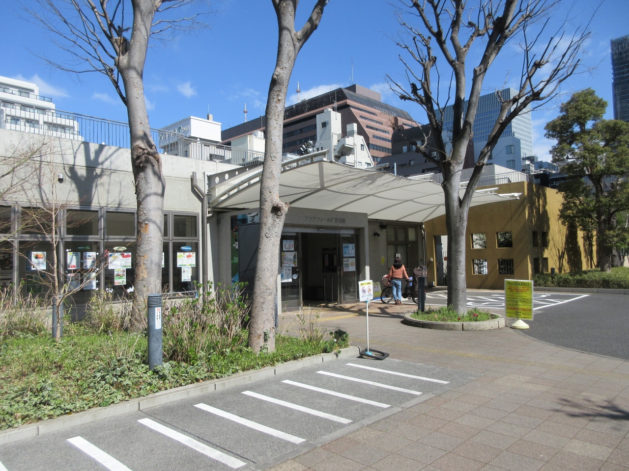 芝公園A3出口そばにあります。訪れた3月はフットサル場でした。夏期にはフットサル場になっている多目的運動場が屋外プールに変わります。可動式床なので全く異なる使い方ができる都市型スポーツ施設です。人工芝が敷き詰められている3面コートが50mプールになることがイメージできませんでした。受付やロッカーなどがある建物のロビーにテーブルやベンチがあり、持ち込んだ昼食を食べている人たちが多くいました。飲み物の自販機がある明るい空間は周辺の勤め人の休憩所のようでした。