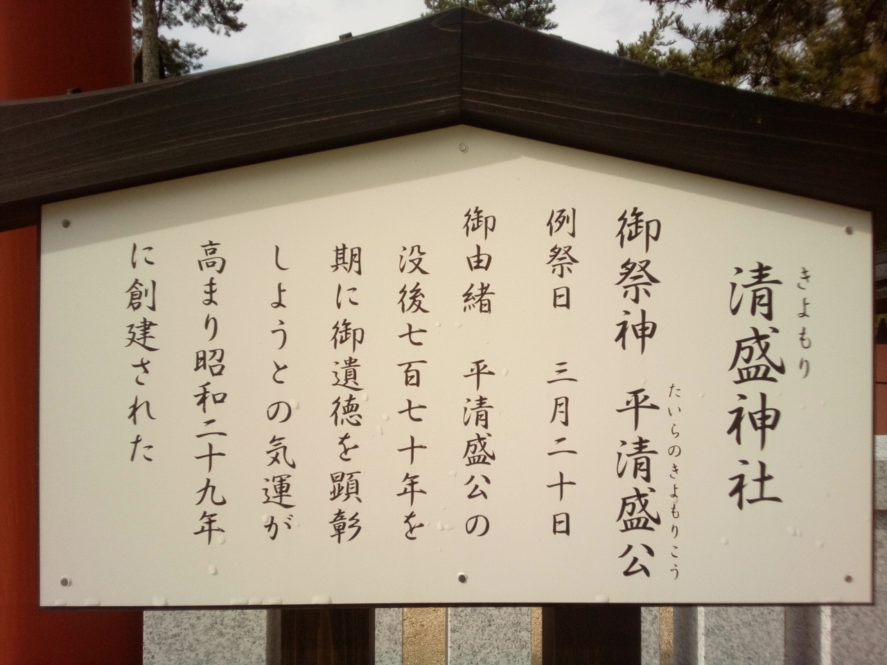 こじんまりした静かな神社でした。厳島神社の人の多さと対照的です。境内より海が見渡せるので、景色はとてもよいです。境内の掲示によると平清盛が創建したのではなく、没後770年を記念して昭和29年に創建されたようです。