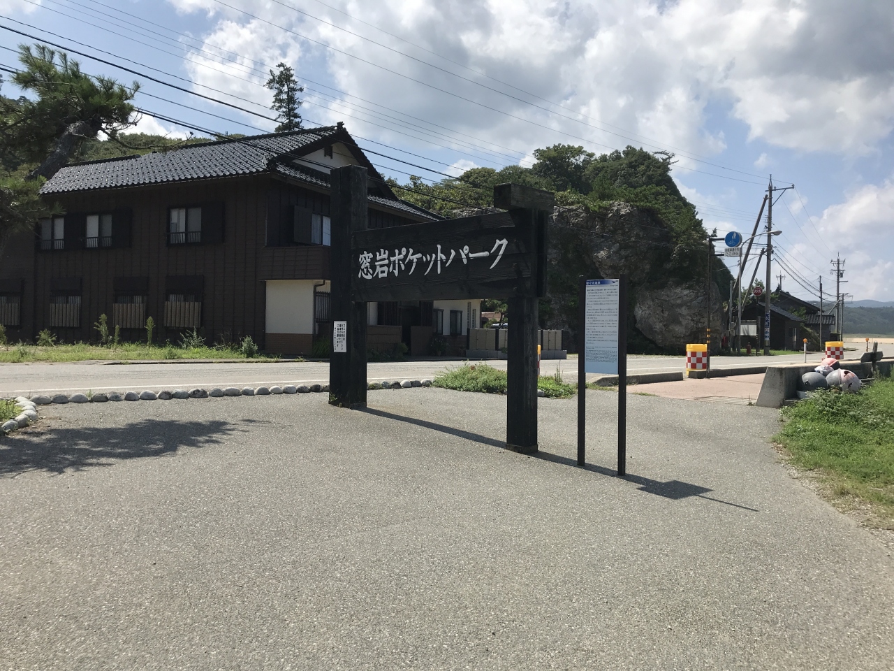 海岸線に沿って国道が走っているので、窓岩ポケットパークの名称でちょうどいい場所に駐車場が作られていました。駐車場のすぐ隣が窓岩を見るちょうどいい角度でした。波打ち際近くの場所なのできれいな海も楽しめます。