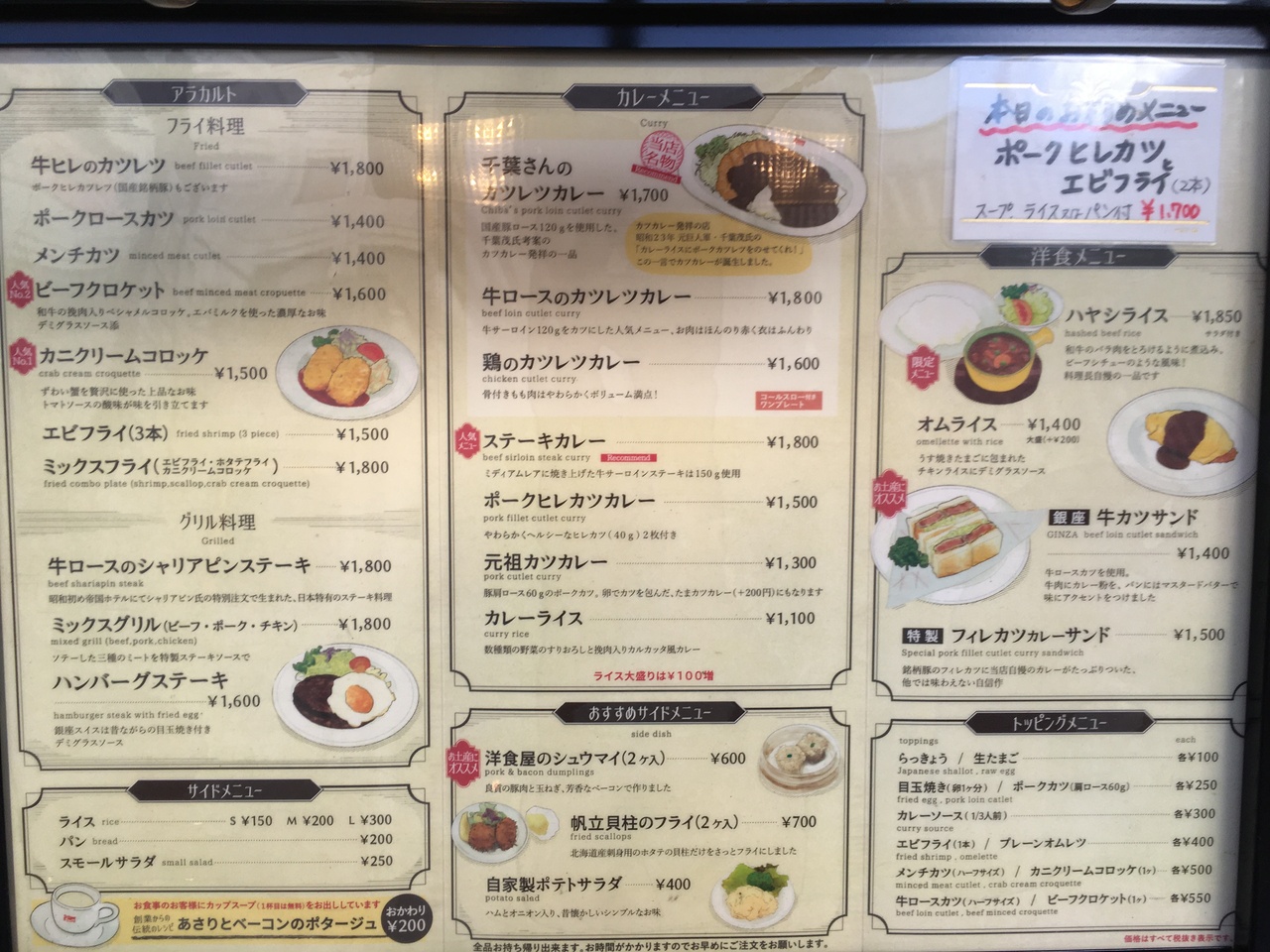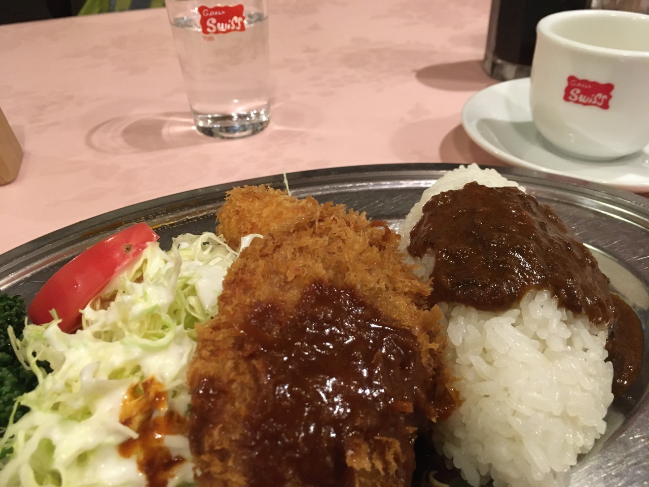 待つことしばし、ランチプレート登場。メンチカツ、コロッケ、ご飯にカレーソースがかかってサラダも添えられている。要するに、お子様ランチな雰囲気。揚げたてで衣がサクサクのメンチカツは、切るとじんわりと肉汁が溢れてくる。口に運べば優しい洋食の味。コロッケにしても、ひねりは無いけど、真面目でじんわりと美味しい。ご飯にかけられたカレーソースは、あくまで添えられた体なので、カレーライス的な迫力は無いが、定番の洋食を美味しくつまみ食いできている感がたまらなく楽しい。