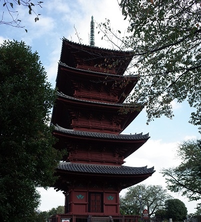 池上本門寺にある1607年建立の五重塔。仁王門、大堂からは少し離れた墓地の入口付近にありますが、その高さからも存在感がある立派な塔です。朱色というよりもえんじ色に近い落ち着いた色合いでした。