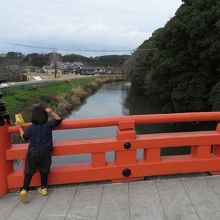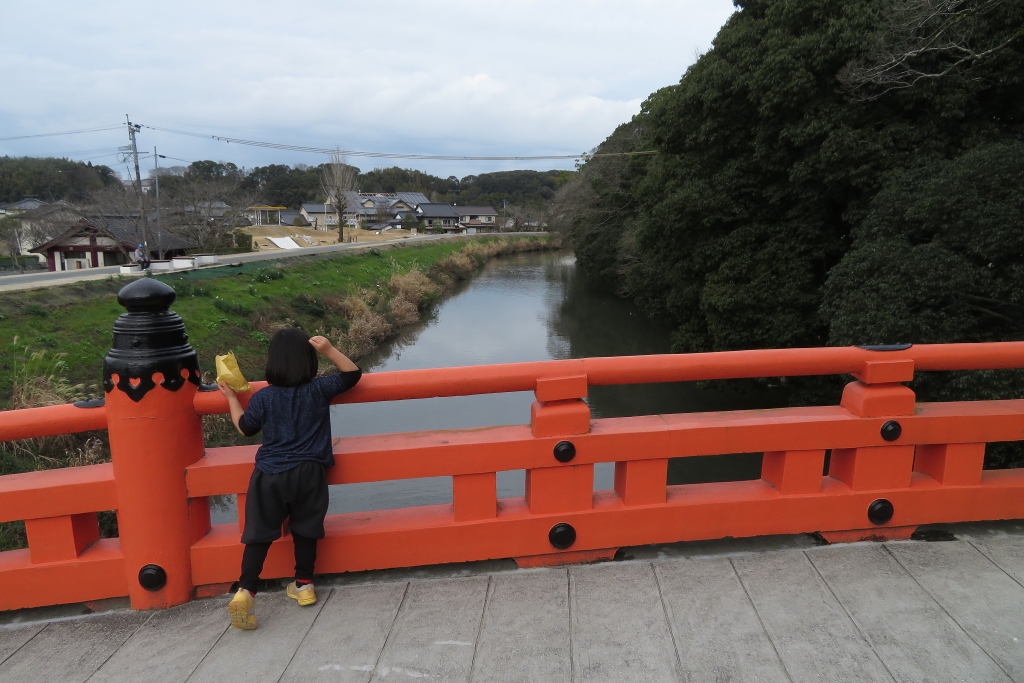 奈良時代の国道だった勅使道をまっすぐ歩いて来ると、寄藻川にぶつかり、その川の上に呉橋という橋がかかっていますが、通行禁止となっています。この橋は一般の方は通行できないため、そうした方々が宇佐神宮を参拝するために、呉橋の横にかかっているのが、この神橋です。名前は大変立派で、かつ気軽にわたってよいのかと一瞬躊躇する朱色の橋ですが、何の問題もなく通行できます。