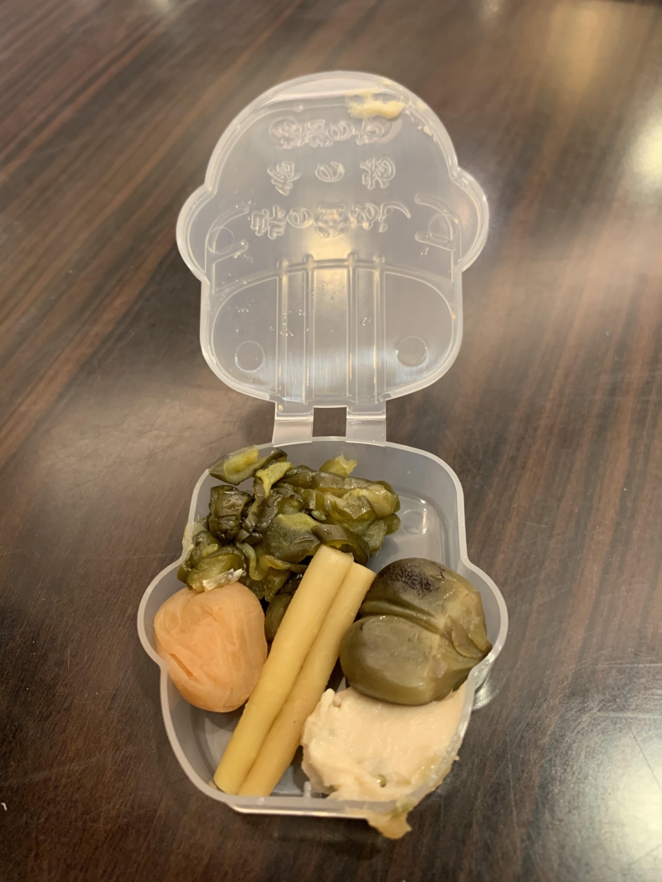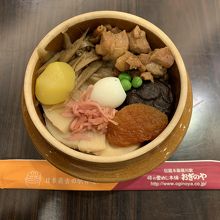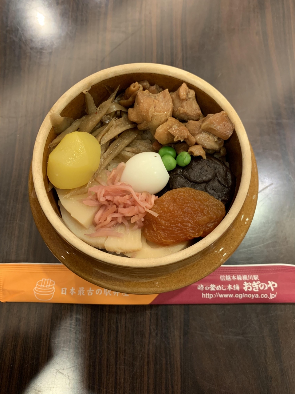 彩りよく数種類の具材が入っていて、見るからに美味しそう!でした。小さなパックにお漬物がたくさん入っていて良かったです。釜飯の釜は、持ち帰っても良いとのことでした。