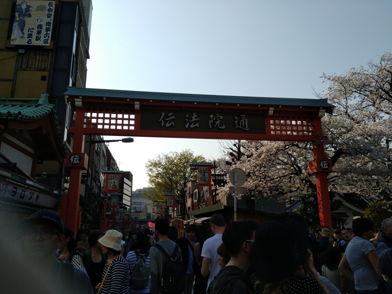 隅田川で桜を見た後、浅草寺に向かうときに通った伝法院通り。