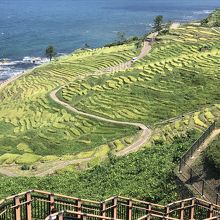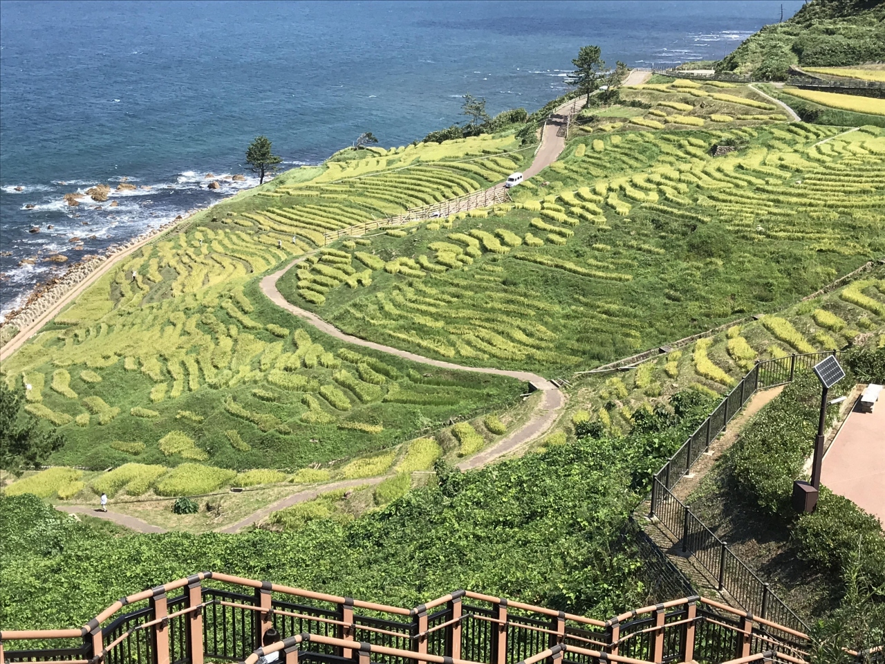 天候に恵まれた日でしたので、隣のポケットパークから眺める千枚田は絶景でした。ただ、観光写真よりもややしょぼかったです。沢山の棚田の中には休耕田のような場所がちょくちょくあり、勇壮な観光写真とはちょっと雰囲気が違うので、あまり期待が大きすぎるとがっかりするかもしれません。棚田上になっているのは、この場所だけの様です。