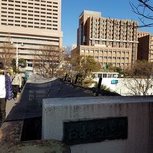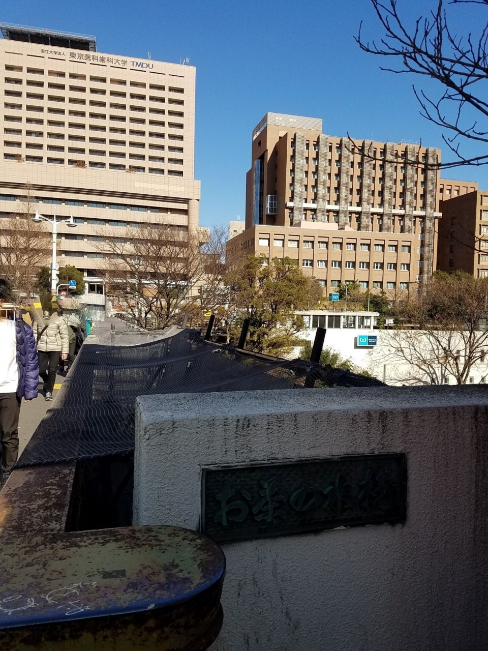 JR御茶ノ水駅の西側の出口を出て右側にあります。神田川に架かる橋ですが駅周辺を工事中で下流側は川もよく見えませんでした。上流側は神田川とJRの電車がよく見えるので橋からの景観を求めるなら今のところは上流側をおすすめします。