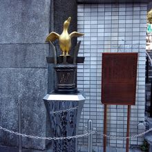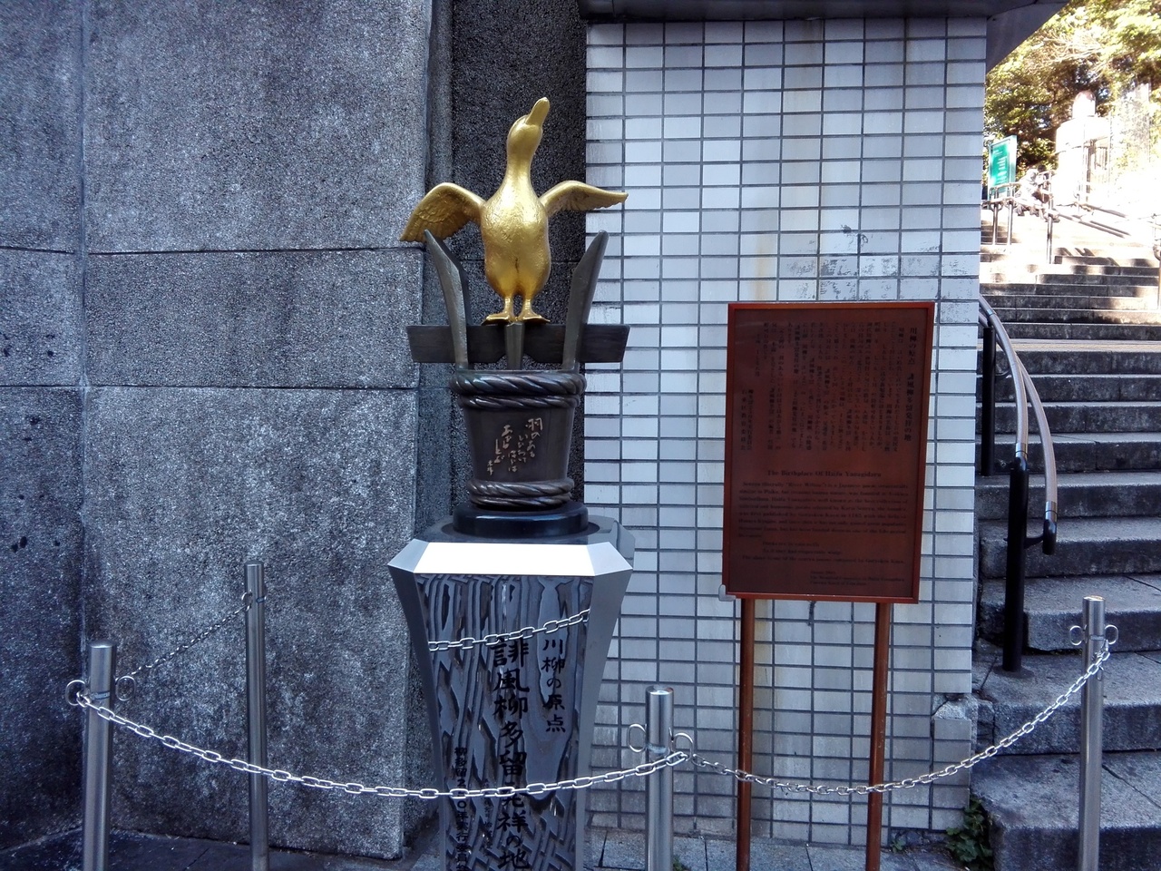 京成上野駅近くにあり、川柳の発祥の地を記念して建てられたものです。俳句と文字数は同じですが、庶民生活に視点を当てた歌で、柄井川柳の創刊した川柳集誹風柳多留[はいふうやなぎだる…難しい名前]が人気となり、江戸で流行りました。樽と金色のアヒルの像が置かれてます。