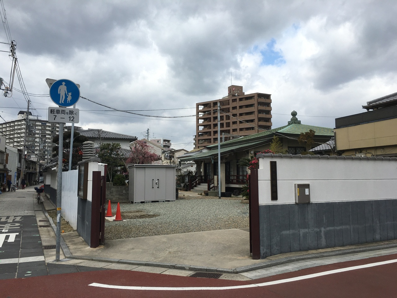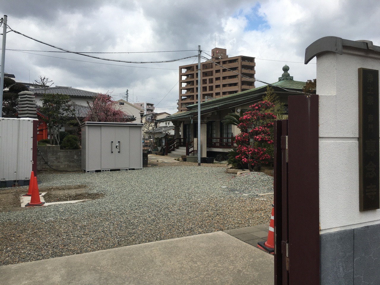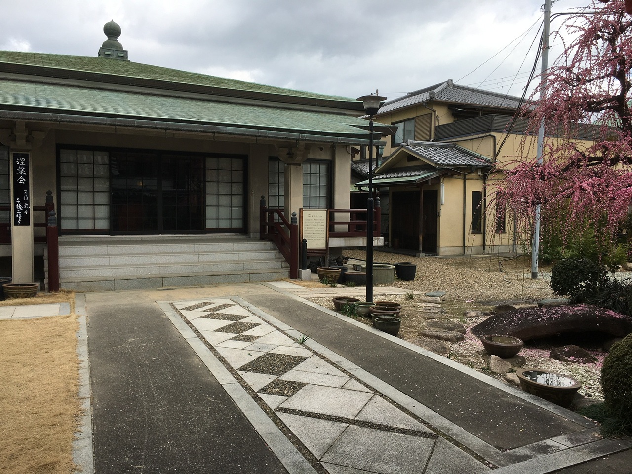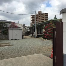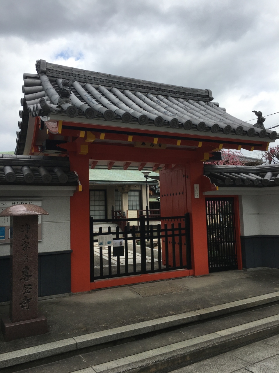 赤い門の正面には本堂があって、左側に北向地蔵がありました。本堂右側は小さな石庭のようになっていて梅の花が見事に咲いていました。赤い山門の左側から出入り出来、開放的な寺で、砂利がたくさんひかれていました。