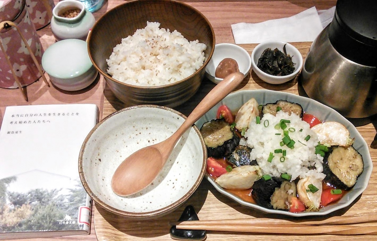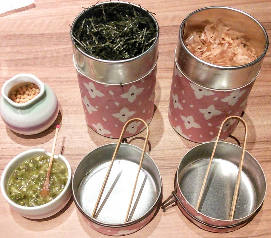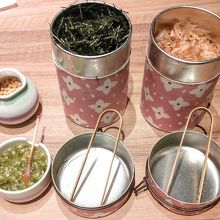 海鮮丼系のおひつごはんメニューと、野菜たっぷりのおかずがセットされたお茶漬け膳メニューが楽しめるお茶漬け専門店です。焼き鯖と野菜のたっぷり鬼おろし添え膳と、熱々のSTAUB鍋で提供されるれんこんハンバーグのオニオンスープ仕立て膳をいただきました。おかずとごはんで食事した後、残ったごはんをかつお出汁でお茶漬けにして食べきれるように演出してあるので、ごはんを残すお客の姿も見当たらず、フードロス削減にも役立っているようで、好感が持てました。選べるお茶漬けトッピングのほか、テーブルの上にかつおぶし、刻み海苔、あられ、わさびが常備されていました。
