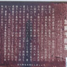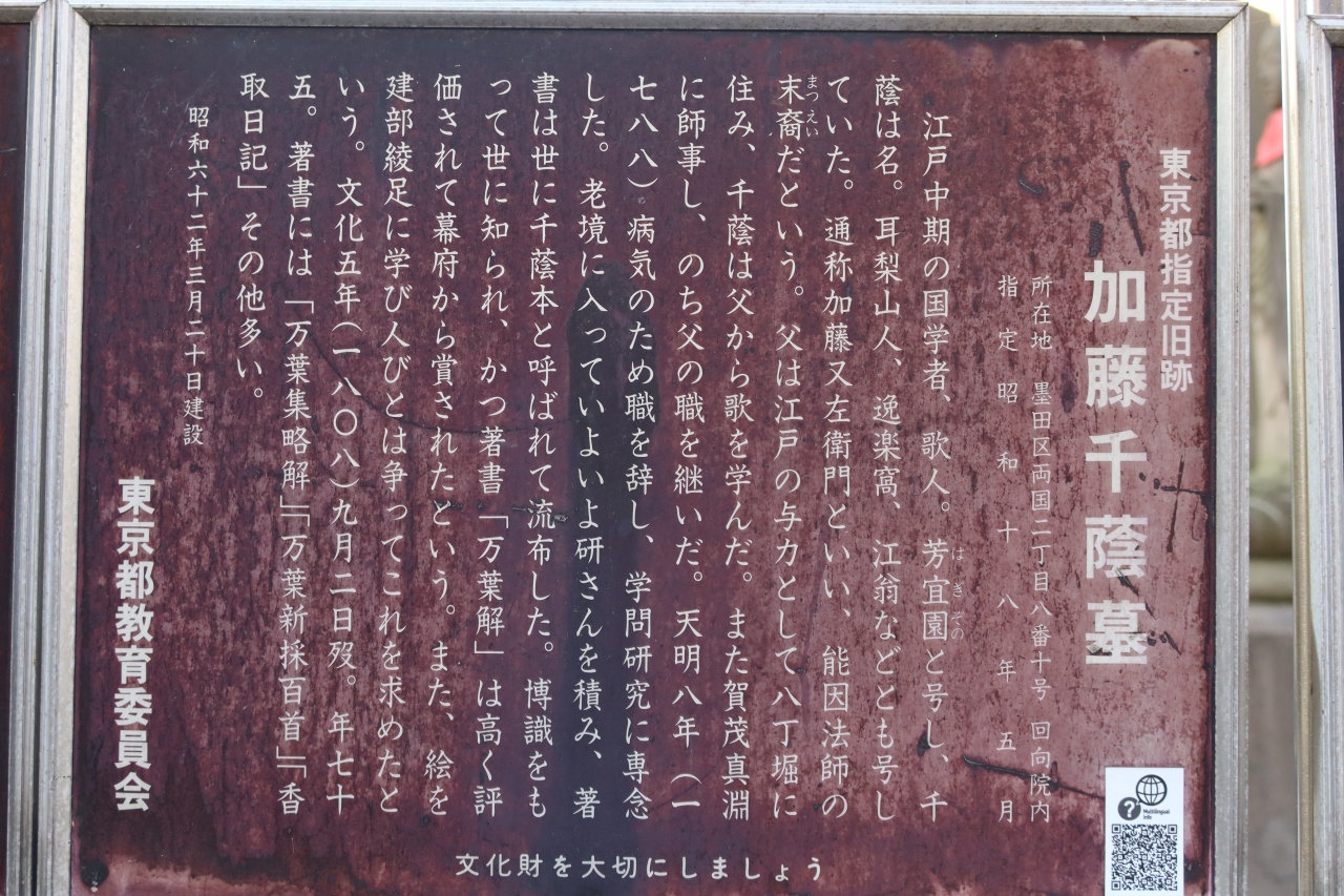 両国の回向院にある力塚の傍に加藤千蔭墓の説明板があります。加藤千蔭は江戸時代中期の国学者・歌人で、「万葉集略解」等の著書を書いた人だそうです。全く知らない人で勉強になりました。説明板の傍には墓はなく、何処に墓があるのか、探してみましたが、どこにあるのか分かりませんでした。