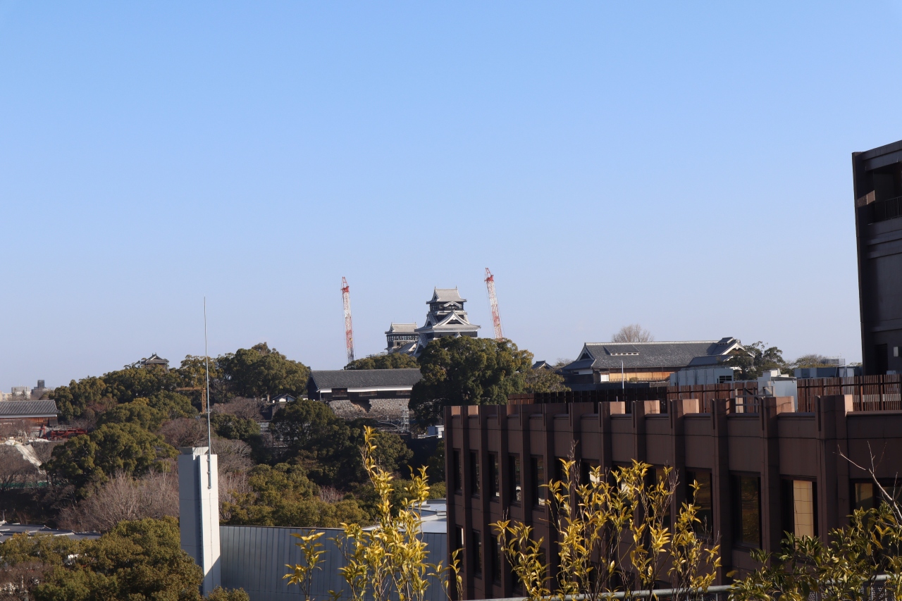 水辺や豊かな緑があって癒しの場ですね、熊本城も望めます。