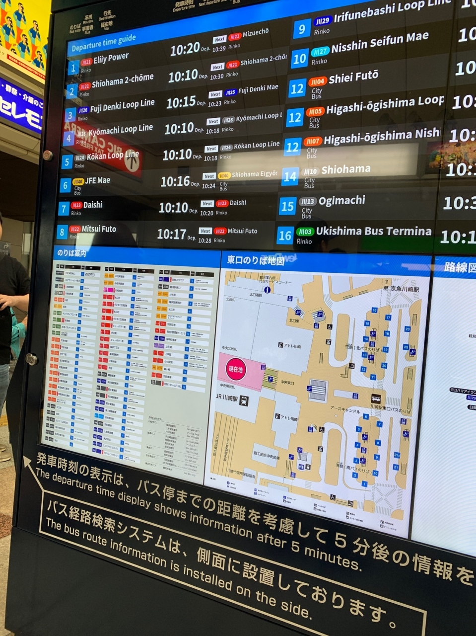 蒲田から京浜東北線を使って川崎まで行きました。一駅ですが、大きな橋を渡るため意外と距離があります。スピードが出ているようで結構車体が揺れました。川崎駅はきれいに改装されていて改札出てすぐにバス停の早見表がわかりやすく配置されていてよかったです。