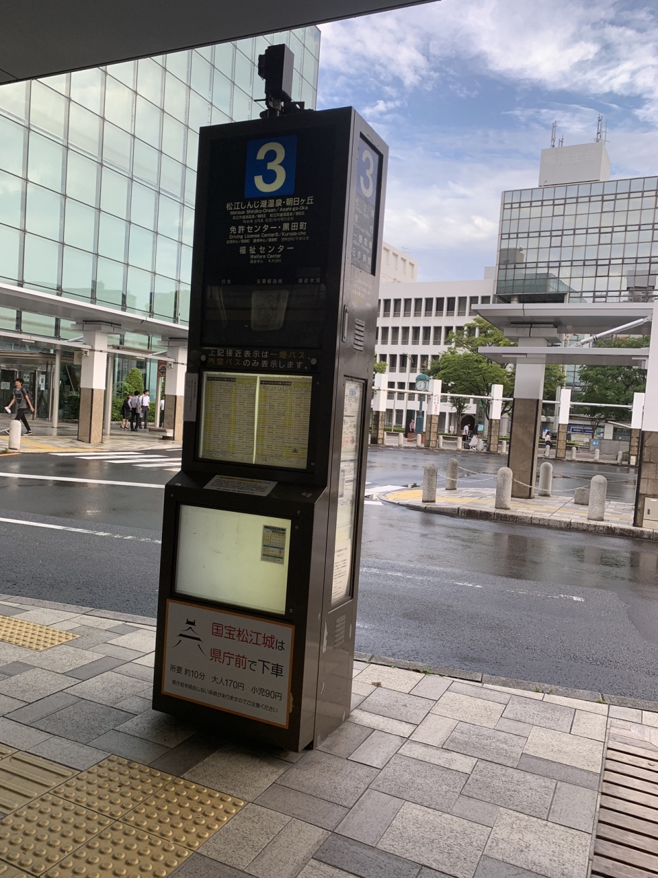 松江駅のバスロータリーから松江城に行くためこちらのバスを利用しました。松江城には県庁前で下車すると近いと表記されていました。駅から170円で末裔上まで行けるのでお安くって助かります。バスロータリーは広いので、観光案内所で場所を確認してから向かうと良いでしょう。
