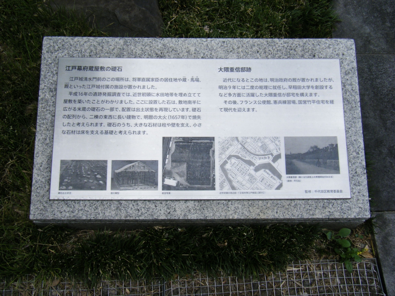 2019年8月に皇居周辺を散策した際に立ち寄りました。皇居のすぐ近くの清水門そばにある千代田区役所の目の前に史跡がありました。江戸時代にはここに将軍家に仕えた家臣たちの居住地や蔵、厩などがあったことが平成16年の発掘調査で明らかになったそうです。竹が植えられた芝生に石が並べられているだけの場所ではありますが、このように当時の姿を少しでも残してくれるのは歴史の勉強にもなりますし、素晴らしいスポットだと思います。