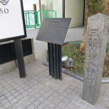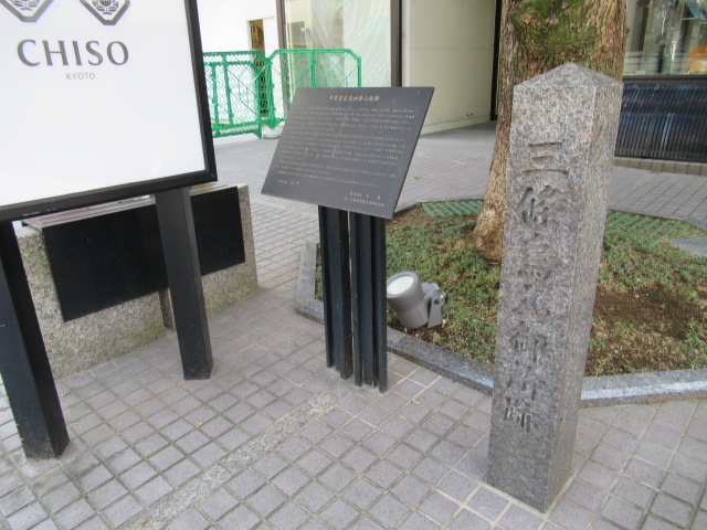 三条通界隈には多くの史跡が残されています。この石碑「三条烏丸御所跡」は三条通りの烏丸を西へ入った南側の㈱千總さんの前にあります。