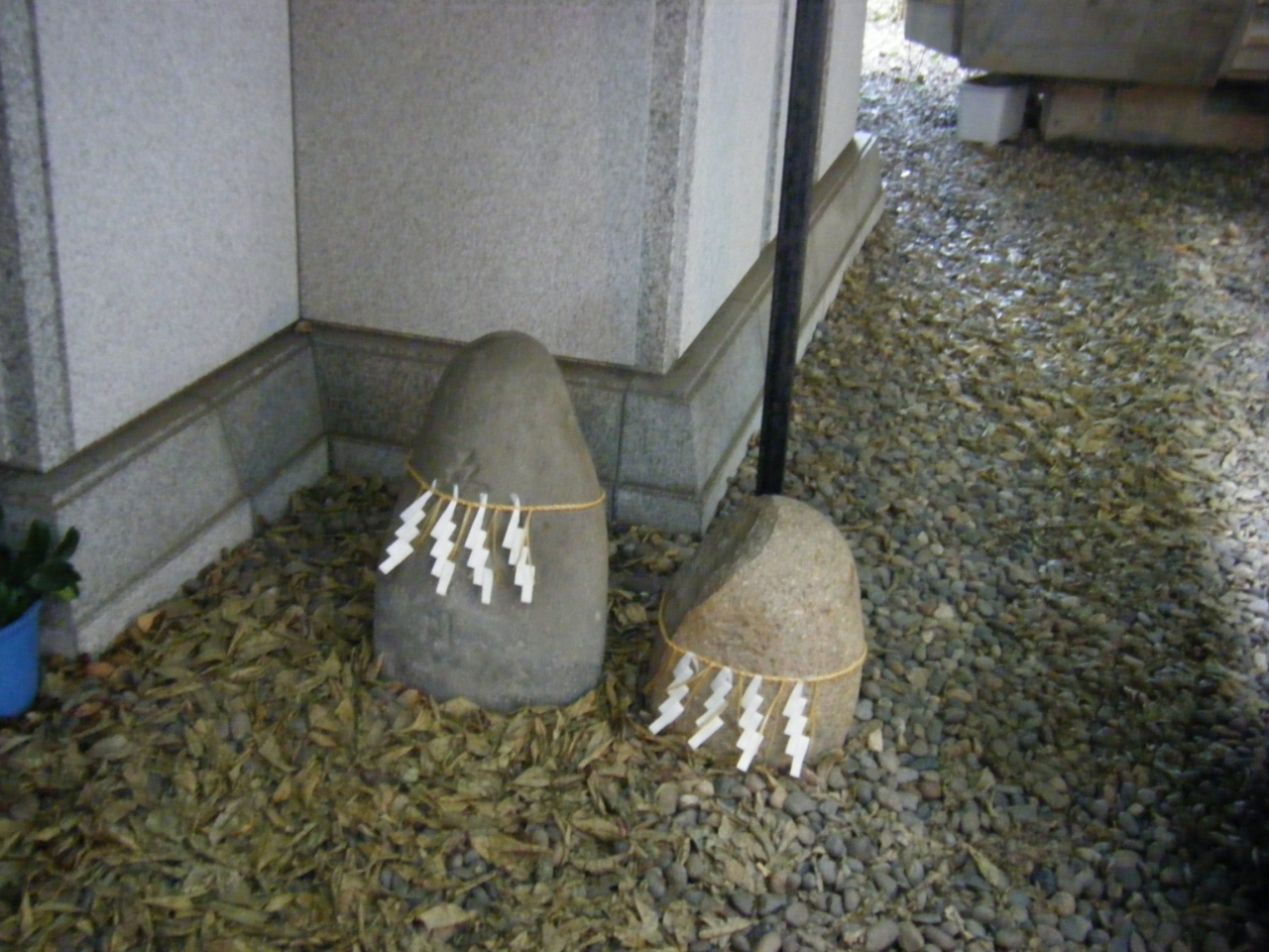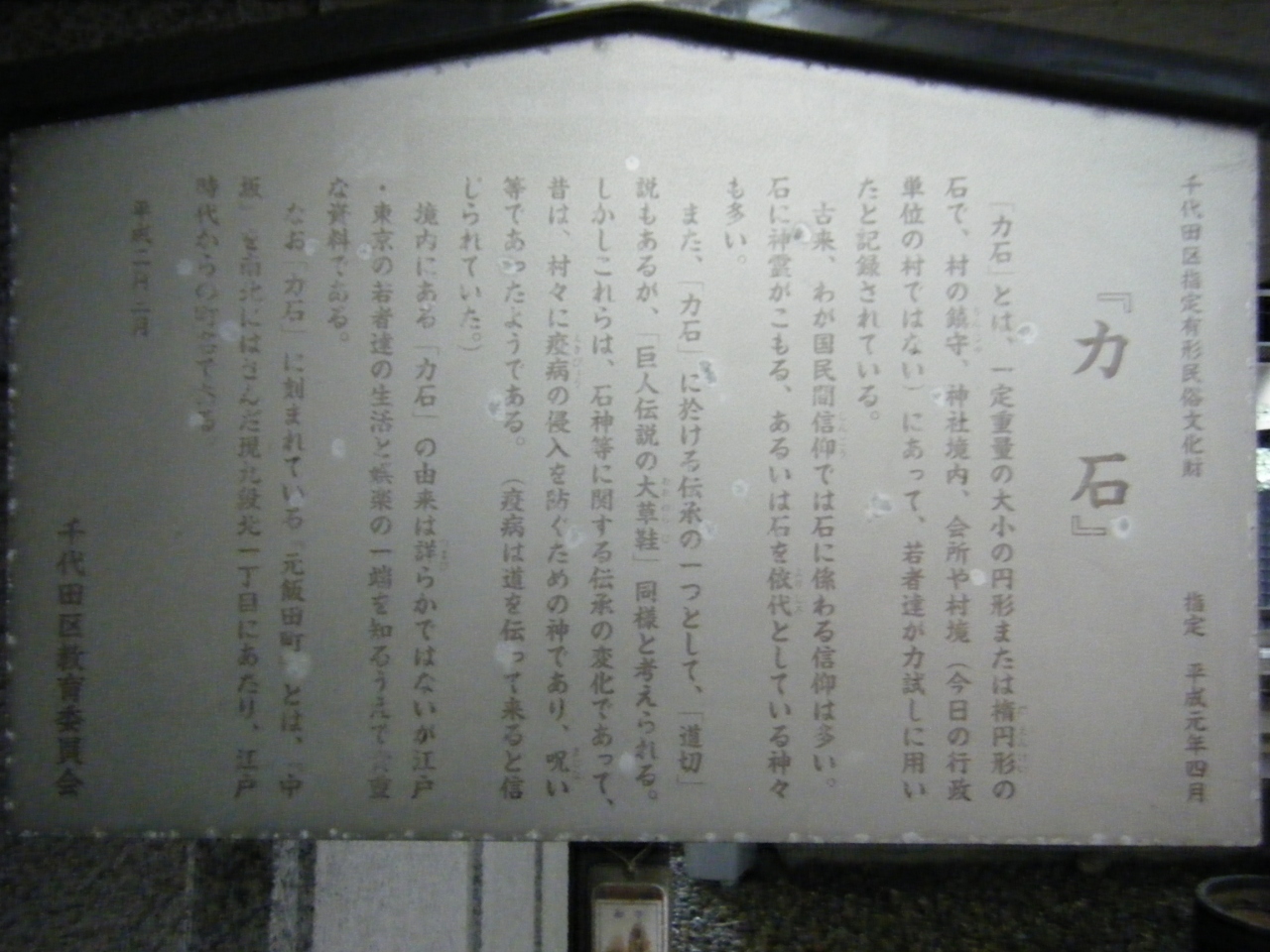九段下駅を降りてすぐ、九段坂よりも1本北側にある中坂という坂道の真ん中付近に築土神社があり、その境内(本殿向かって左手奥にありました)に力石が置かれていました。2つの力石があり、いずれもしめ縄に紙垂が付けられており、神聖なものとして取り扱われていました。力石には2つとも文字が彫られており、おそらくは重量などが書かれていると思うのですが、薄暗かったのと紙垂があったので文字を確認することはできませんでした。それほど大きな力石ではありませんが、持ち上げたら腰を痛めてしまいそうな重さはありそうでした。