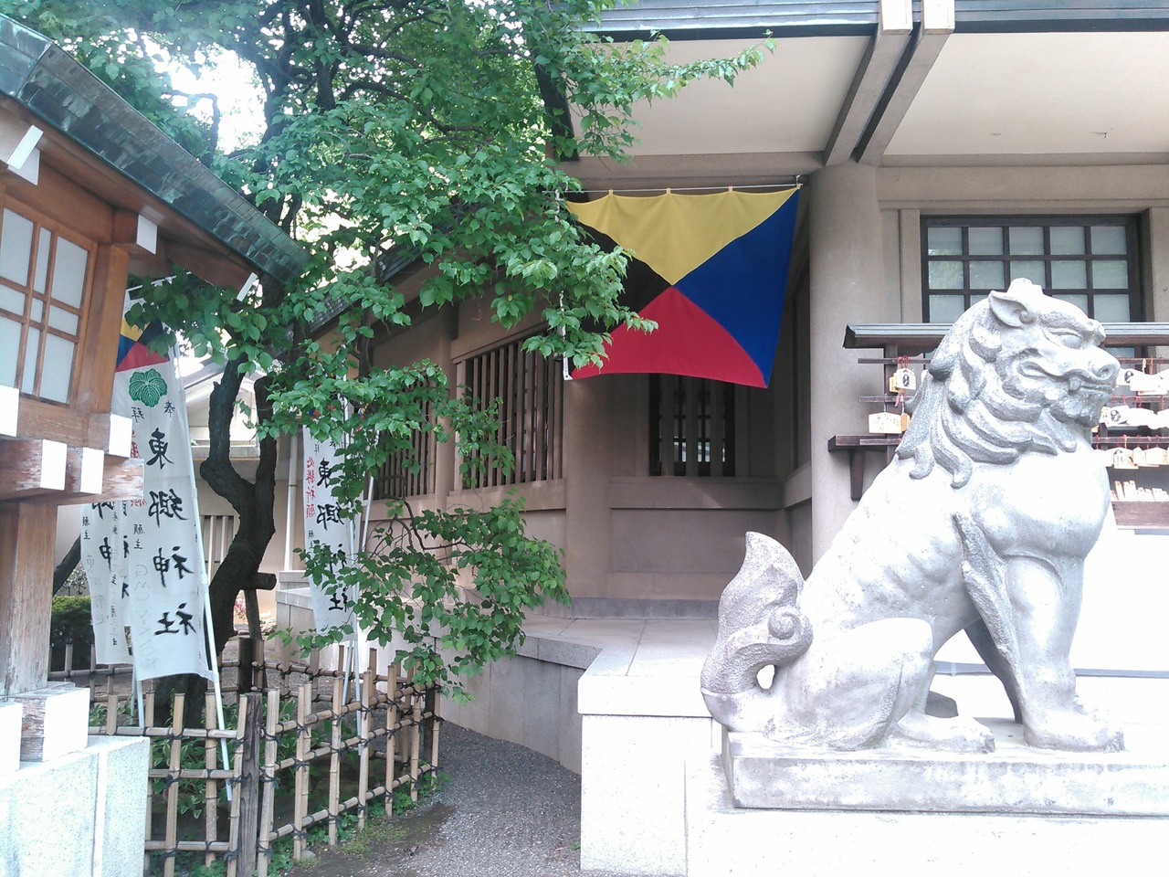 原宿駅からほど近く、竹下通りからも近い順ところにありますが、周囲の賑わいとは対象的に境内はとても静かです。周りはビルに囲まれていますが、この一角だけは別世界です。拝殿左手にはZ旗が掲げられていました。
