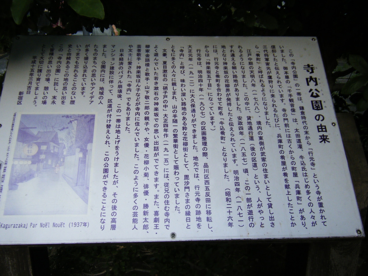 寺内公園(じないこうえん)は神楽坂の住宅街に囲まれた場所にある公園です。公園といっても子供たちが遊ぶそうな遊具などがあるような公園ではなく、腰を掛けることができる椅子のような石と緑があるだけの小さな広場といった感じの場所でした。鎌倉時代からこの地には行元寺というお寺がありましたが、明治時代に入り区画整理で行元寺は五反田に移転してしまったそうです。移転後も行元寺の跡地は「寺内」と呼ばれ、地域の方々に大切にされ、それが現在の寺内公園となり今に至ります。そういった深い歴史があり、大切にされてきた場所という事がわかり心が温かくなりました。