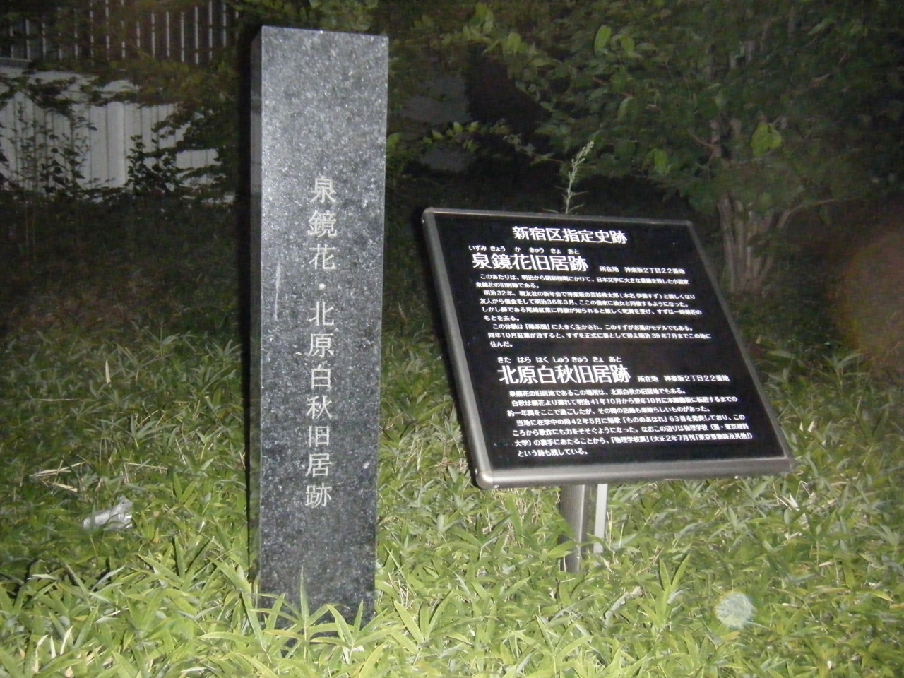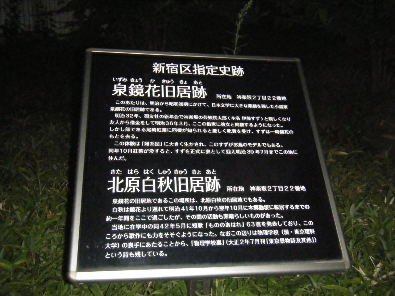 地下鉄飯田橋駅B3出口を出て徒歩1分ほど、神楽坂の1本南側の通り沿いに泉鏡花旧居跡 北原白秋旧居跡はあります。泉鏡花は明治時代から昭和にかけて活躍した小説家で、北原白秋は同じ時代に活躍した詩人です。2人がこの地に住んでいた時期は重なっておらず、偶然の一致のようですね。それにしても同じ時代に活躍した偉人が数年違いで全く同じ場所に住んでいたというのはなかなか面白い歴史ですね。