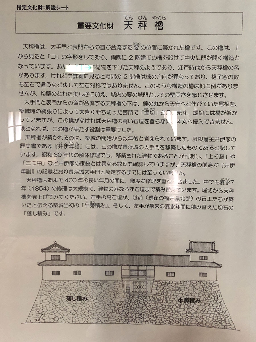 天守閣へ向かう途中にくぐる門です。少し離れて見ると門を中心として左右に(だいたい)対称で美しい様式を見せています。天守閣ほどではありませんが、ここからも城内の景色や彦根の町並みを眺めることができます。オススメです。