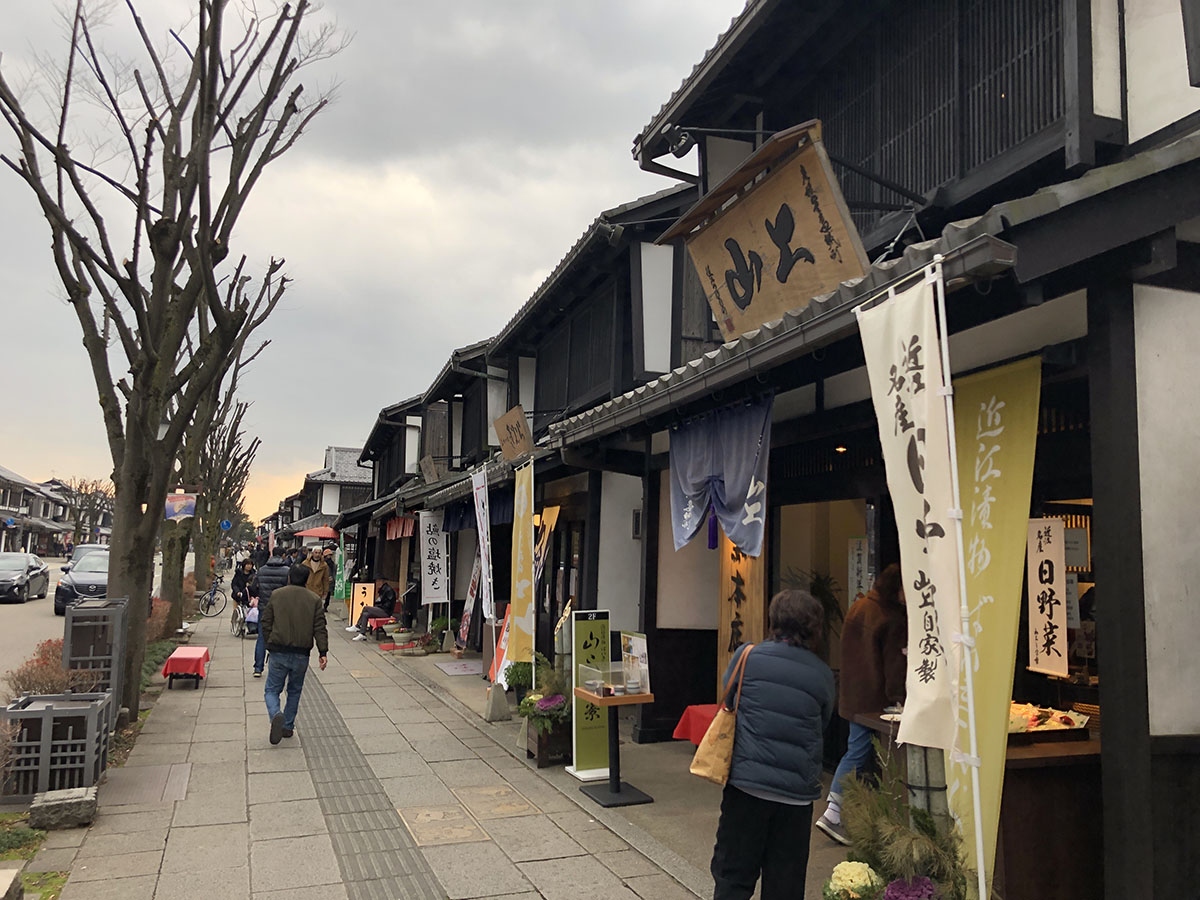 彦根城のお堀にある京橋から南へ延びる通りで、お食事どころ、カフェ、軽食のテイクアウト店、お土産屋さんなど色々並んでいます。基本的に白壁の町家風のデザインに統一されていて、江戸情緒を感じさせるスポットです。