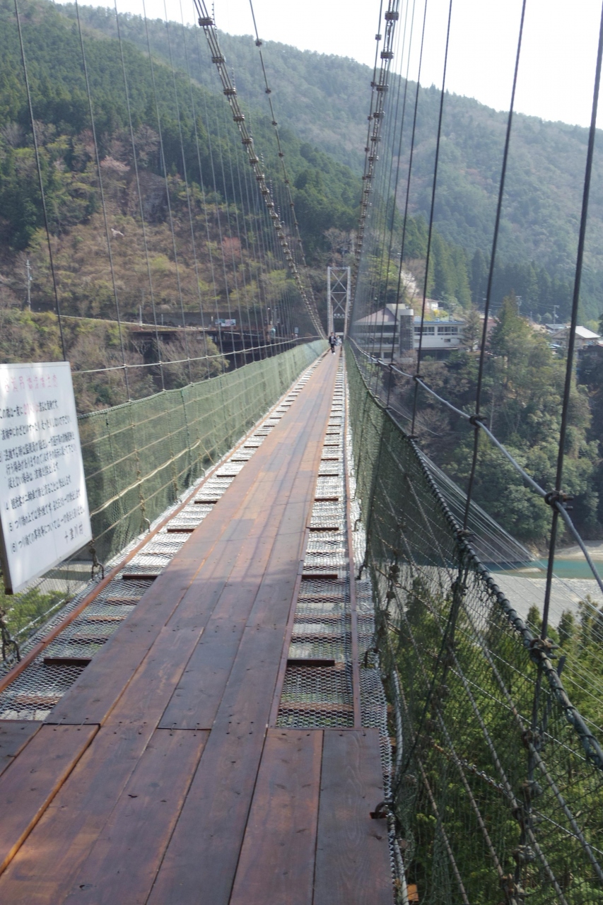 以前から渡って見たかった吊り橋なので、行って帰ってくるだけですが、渡れて嬉しかったです。駐車場は有料で、渡るのは無料でした。駐車場の代金の一部が橋の維持管理に使われているのだと思います。かなり高くて長いので揺れもあり、途中で引き返している人もいました。