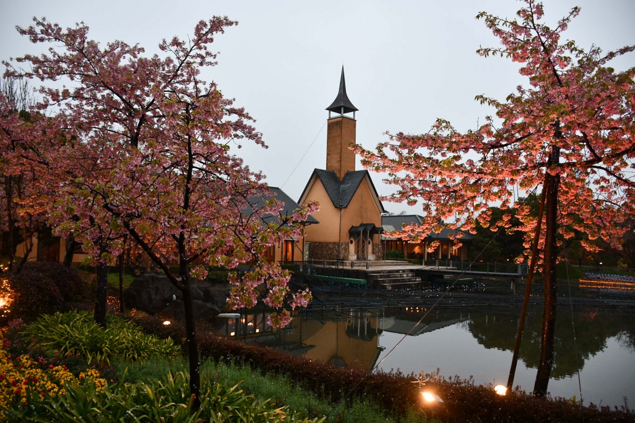 川を渡れば、お隣は愛知県という桑名で、夜間照明と温室が見事な、なばなの里。特に多様なベゴニアを集めた温室は見事です。また河津桜が満開に近く、日が暮れる前と夜桜を楽しむことができました。広い園内は一年中、四季折々の花で彩られていることでしょう。