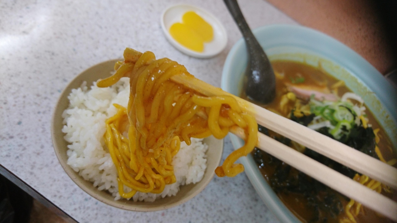 室蘭と言えば、北海道第4のラーメンと言われているカレーラーメンです。カレーラーメンくらいは、ほかの土地でも食べられますが、やはり本場、室蘭のカレーラーメンが食べたくてこの店に行きました。やはり、みんなカレーラーメンを注文していました。地元の人にも愛されているカレーラーメン。食べてみると、やはりおいしいラーメンでした。スパイシーの中にも甘みのあるスープ。思わず、ご飯も注文しラーメンライスでいただきました。とてもおいしかったです。カレーラーメンには、ライス追加がおすすめです。