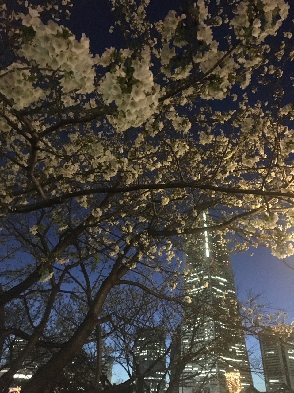 毎年、桜の季節に汽車道を歩いています。道に沿って、たくさんのソメイヨシノが枝を拡げています。今年は、樹々がライトアップされる夜に出かけてみました。みなとみらい の夜景をバックにした桜は幻想的。花を見上げながらの散歩は、春らしくていいものですね。